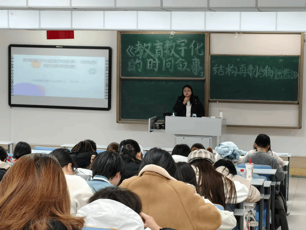 讲座伊始,姜文静老师结合当前教育数字化转型的时代背景,从“时间叙事”这一独特视角切入,系统梳理了教育数字化从技术应用到生态重构的发展脉络。她深入剖析了教育数字化进程中“结构再制”的内在逻辑——即技术如何重塑教育教学的组织形式、互动模式与资源配置方式,并清晰地阐释了“秩序型塑”的实践路径,揭示了数字化时代教育规律与技术逻辑的融合之道。同时,姜老师针对小学教育的专业特色,重点解读了教育数字化在课堂教学创新、学生成长评价、家校协同育人等场景中的应用要点,让在座学生对教育数字化的核心内涵与实践价值有了更全面、深刻的认知。