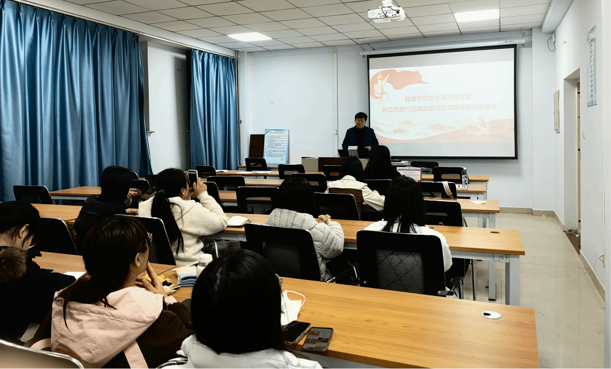 2026年3月14日,太阳成集团tyc41183学生第六支部全体党员在学院楼A405召开树立和践行正确政绩观学习教育启动部署会,学院党委书记周越参加会议。