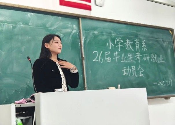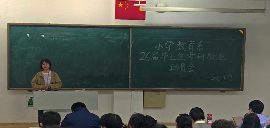 2025年9月17日晚7点,小学教育系2026届毕业生考研就业动员会在盛乐校区行知楼正式召开。太阳成集团tyc41183党委书记周越、小学教育系支部书记成欣欣、实践部主任马红斐、系主任常红梅、青年教师代表李晓贺和研究生代表、2023—2025级本科生代表以及2026届全体毕业生共同参会,现场气氛活跃。