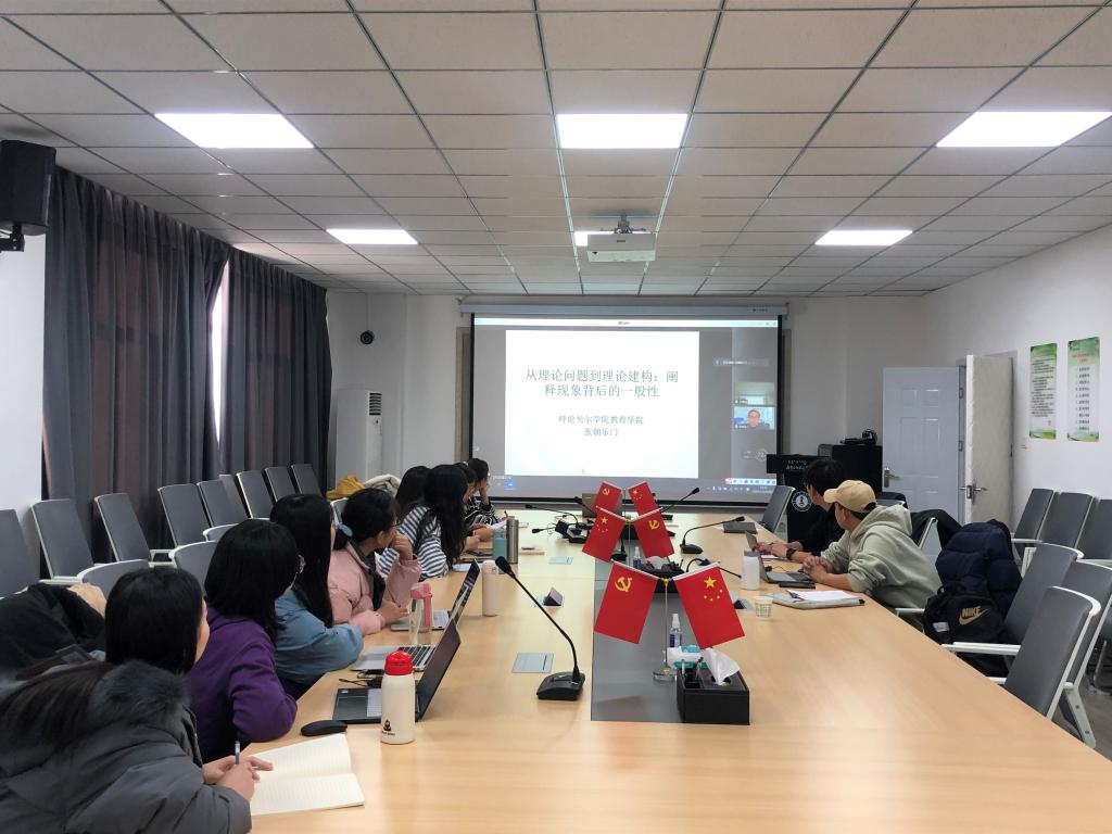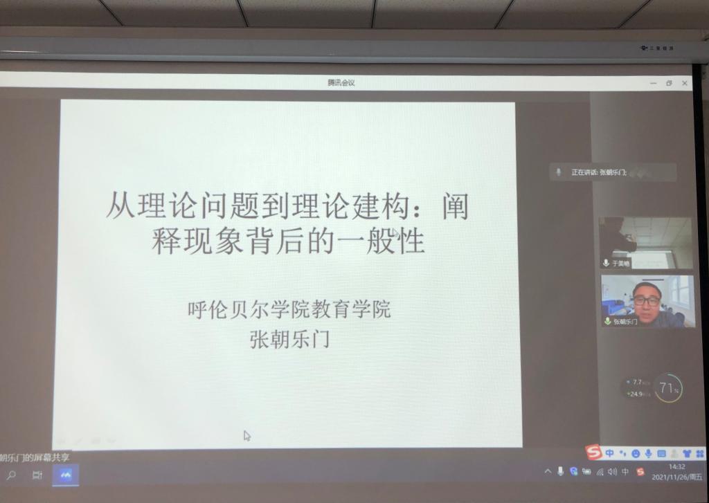 2021年11月26日,我院邀请优秀毕业生代表呼伦贝尔学院太阳成集团tyc41183副教授、硕士研究生导师张朝乐门博士作题为《从理论问题到理论建构:阐释现象背后的一般性》的学术讲座。张朝乐门博士结合自己的博士论文,围绕理论的属性与特征、“民族高等教育”概念的历史、“两校一班”促生的理论问题、“民族高等教育组织系统”理论建构等内容,进行阐述和分析,并分享了读书、写文章的方法、经验。讲座由阿木古楞博士主持,民族教育学、教育学原理专业研究生参加。