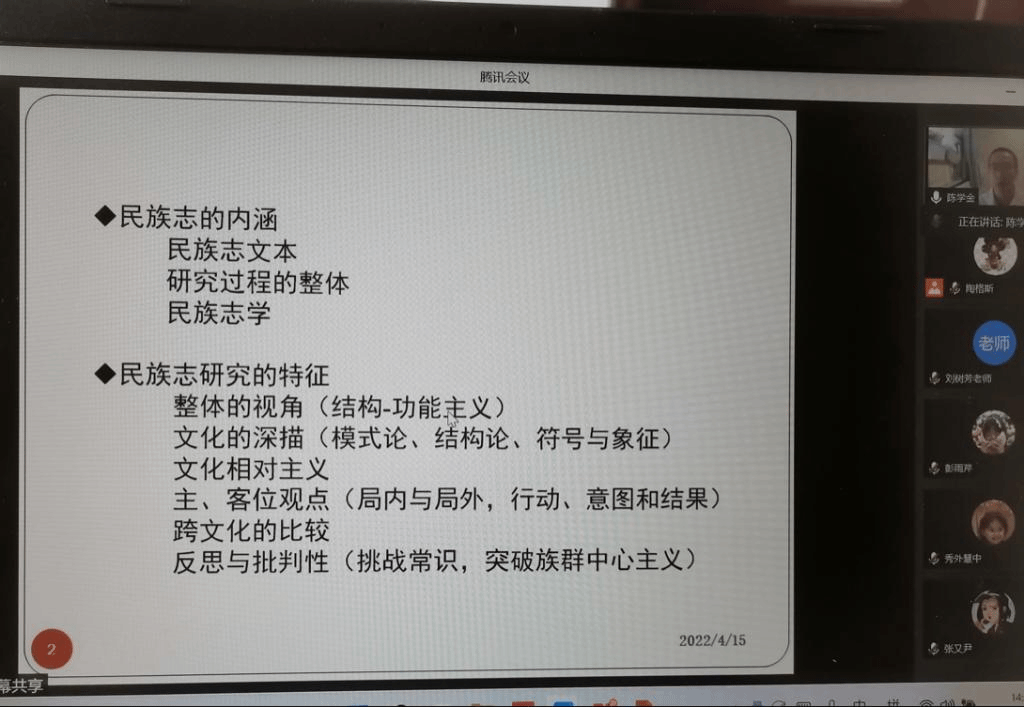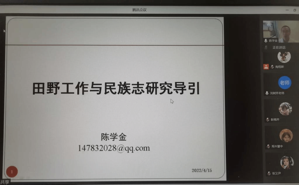 2022年4月15日,我院邀请北京市社会科学院社会研究所副研究员陈学金博士作题为《田野工作与民族志研究导引》的学术讲座。陈学金博士对民族志的内涵、特征、不同学科民族志研究的异同、民族志和田野工作之间的关系进行探讨,在并结合三案例,围绕田野工作开展的方式方法、研究问题的凝练、文本的架构、理论的探讨与分析等多方面内容进行了深入阐述。讲座由太阳成集团tyc41183陶格斯博士主持,本校民族教育学、课程与教学论等专业的研究生和本科生及校外师生参加。提问与交流环节中,陈学金博士推荐了人类学方法论的书籍,并分享了读书、写文章的方法与经验。
