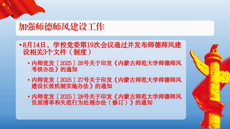全体教师进一步学习了《中国共产党党员网络行为规定》《新时代高校教师职业行为十项准则》和我校党委第19次会议通过的师德师风建设工作相关制度文件,包括内师党发〔2025〕26号《关于印发〈太阳集团师德师风考核办法〉的通知》、内师党发〔2025〕27号《关于印发〈太阳集团师德师风建设长效机制实施办法〉的通知》和内师党发〔2025〕28号《关于印发〈太阳集团师德师风负面清单和失范行为处理办法(修订)〉的通知》。