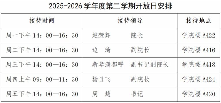 现发布2025-2026学年度第二学期院领导接待日安排情况,欢迎全院师生前来与学院领导面对面交流,携手并进、齐心协力,共促学院高质量发展!